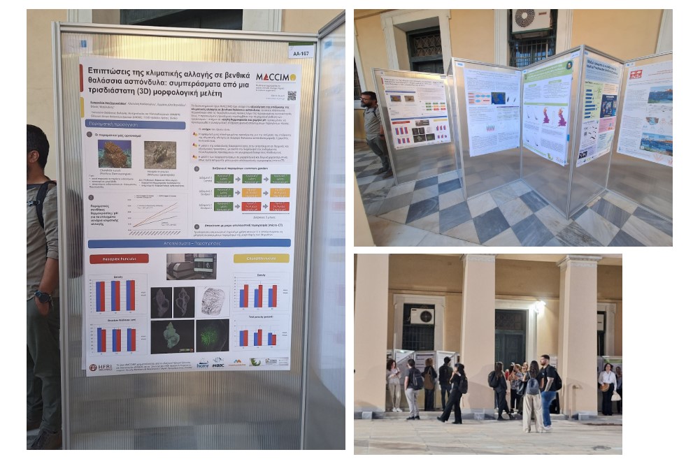 A poster entitled “Climate change stress in benthic marine invertebrates: insights from a 3D morphological study” was presented at the 12th Conference of the Hellenic Ecological Society (HELECOS), held in Athens from 1–4 October 2025, by MACCIMO WP2 leader Eva Chatzinikolaou. The poster showcased the morphological responses of Chondrilla nucula and Hexaplex trunculus to combined temperature and pH stressors using micro-computed tomography analysis. Metrics such as density, structure thickness, porosity, and structure separation (average pore diameter) were estimated, highlighting population-specific and treatment-specific responses.